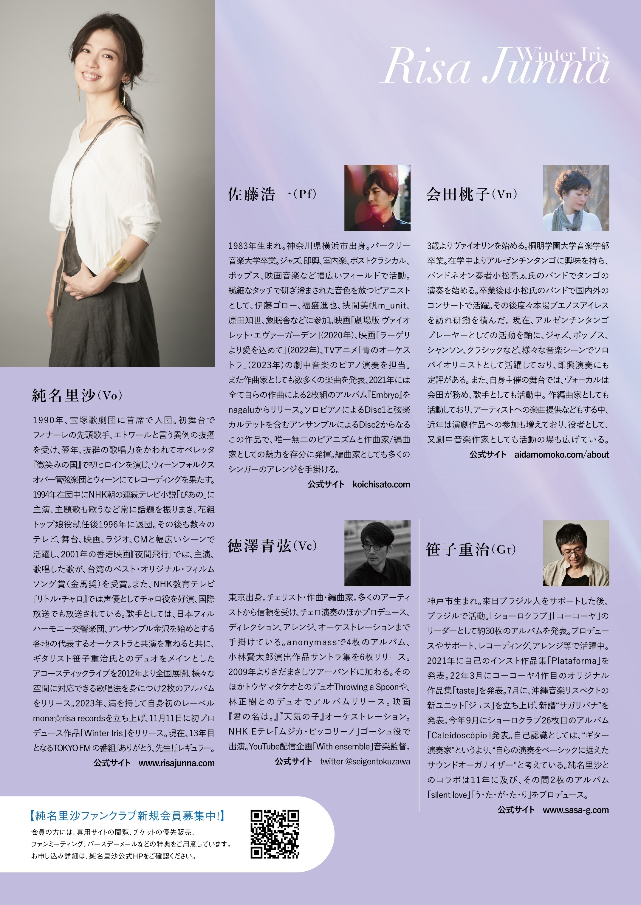 共演には、ピアニスト佐藤浩一、弦楽器にはバイオリン会田桃子、チェロに徳澤青弦という気鋭のミュージシャンに加え、純名の音楽活動を支えてきた唯一無二のギタリスト笹子重治という、繊細かつダイナミックなメンバーでお届けいたします。